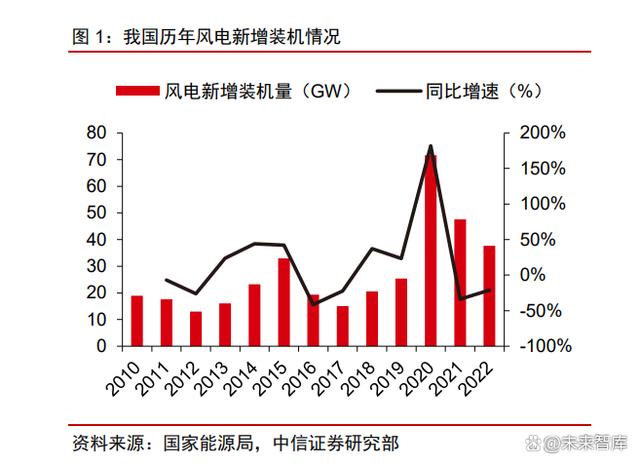 2022 年風電市場裝機表現不佳,但招標量大幅提升 76%。根據國家能源局數據,我 國 2022 年全年風電新增裝機 37.63GW,同比下降 21%,2022 年風機的排產和交付節奏 較慢。2022 年上半年,疫情因素對風電整體施工以及供應鏈的穩定形成較大沖擊,下半 年則由于風機大型化節奏加速,核心材料環節如葉片、模具、鑄件等出現了階段性供應緊 缺,使得全年風機的排產和交付不及預期。但從招標維度看,根據中國招投標公共服務平 臺數據,2022 年風電招標規模達到 95GW,同比大幅增長 76%,我們認為高招標量預示 著 2023 年有望成為風電裝機的大年。