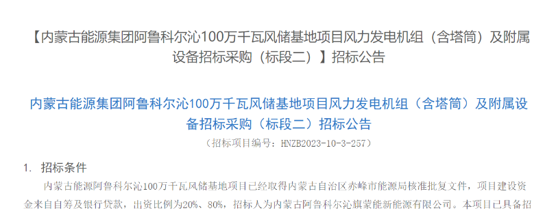 公告顯示,內(nèi)蒙古能源集團(tuán)阿魯科爾沁100萬千瓦風(fēng)儲基地項(xiàng)目位于赤峰市阿魯科爾沁旗天山鎮(zhèn)、天山口鎮(zhèn)、巴拉奇如德蘇木,總裝機(jī)容量100萬千瓦,擬采用100臺單機(jī)容量10MW風(fēng)力發(fā)電機(jī)組。該項(xiàng)目計(jì)劃2023年12月05日開工建設(shè),2024年12月31日全容量并網(wǎng)。