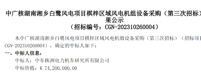 1月2日,中廣核電子商務平臺發布《中廣核湖南湘鄉白鷺風電項目棋梓區域風電機組設備采購(第三次招標)中標結果公示》的公告。
