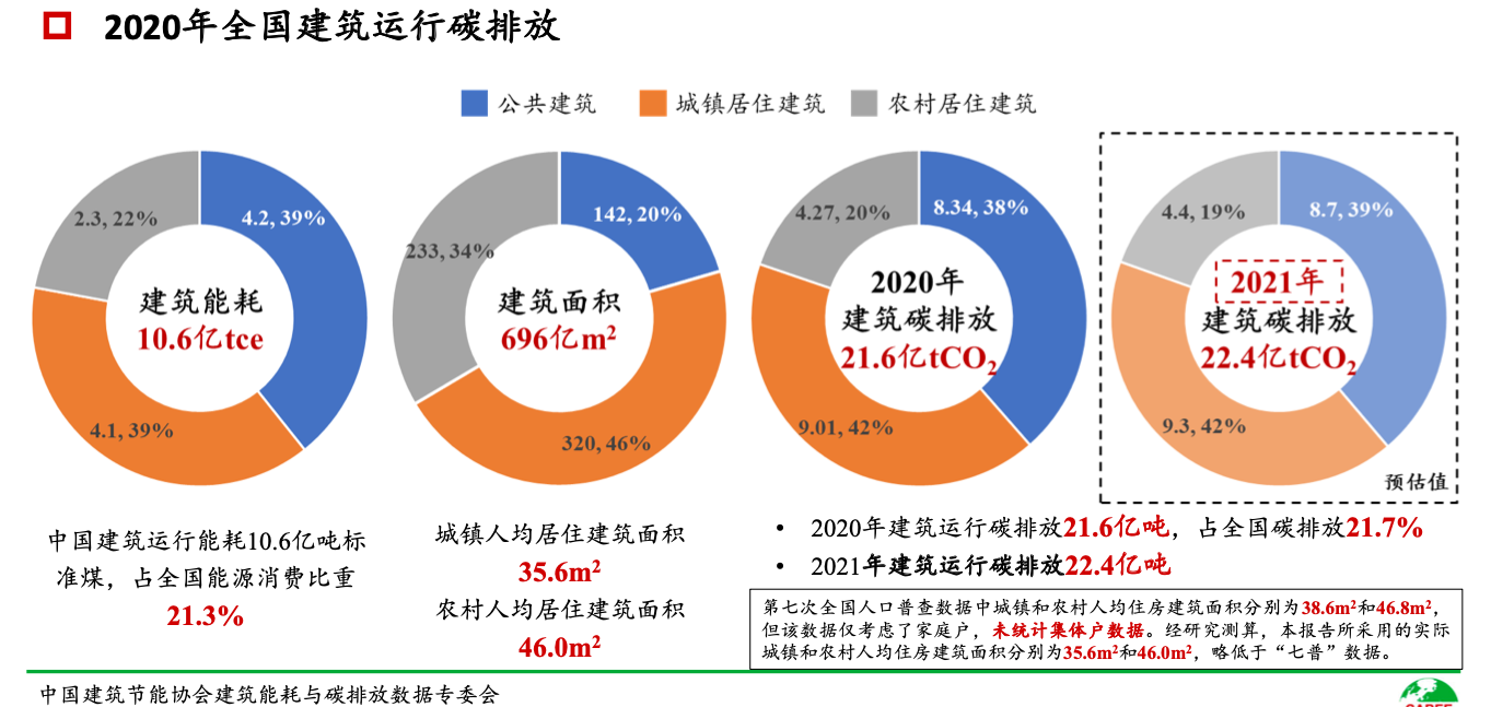 2022年12月28日,由中國建筑節能協會建筑能耗與碳排放數據專業委員會編撰的《2022中國城鄉建設領域碳排放系列研究報告》(下稱“報告”)正式發布。報告披露,2020年全國建筑全過程(含建材生產、建筑施工和建筑運行)能耗總量為22.7億噸標準煤(tce),占全國能源消費總量比重為45.5%;二氧化碳排放總量為50.8億噸,占全國碳排放的比重為50.9%。