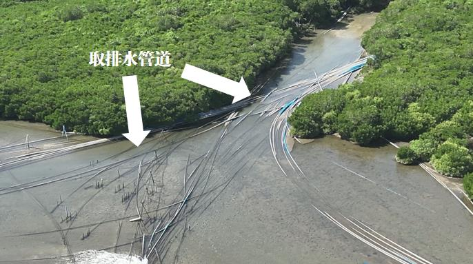 ▲圖5 2023年11月22日,督察組現場督察使用無人機拍攝,養殖塘取排水設施穿越清瀾紅樹林省級自然保護區核心區