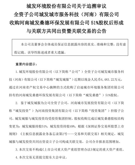 5月10日,城發環境公告,為進一步擴大省內環衛產業市場份額,同時減少同業競爭,公司全資子公司城發城服近期以現金人民幣4483.22萬元,通過在河南省產權交易中心摘牌的方式收購了啟迪城市環境服務集團有限公司持有的河南城發桑德環保發展有限公司51%股權。