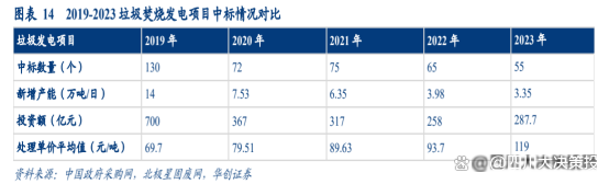 垃圾焚燒新訂單釋放速度繼續減緩、處理費價格提升。2023 年垃圾焚燒新增體量進一步下降,全年中標項目總處理規模 3.35 萬噸/日,同比 2022 年下降 15.83%。與此同時,2023 年平均中標處理單價為 119 元/噸,同比 2022 年增長 27%。近三年以來處理費單價一直維持快速上升態勢,疊加政策推動,我們認為未來垃圾處理費單價有望進一步提升,降低國補退坡的負面影響。