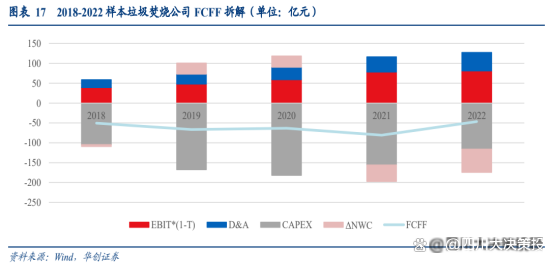 垃圾焚燒行業 FCFF(自由現金流) 拆解。我們選取瀚藍環境、旺能環境、上海環境、中科環保、軍信股份、綠色動力、城發環境和三峰環境 8 家質地較純(垃圾焚燒占營收比重高,暫無明顯第二成長曲線邏輯)的公司作為樣本進行分析:CAPEX 較重,FCFF 尚未轉正。垃圾焚燒行業的固定資產投資較重,據圖概算,垃 圾焚燒設施的單噸投資成本可達 50 萬元以上,CAPEX 對于 FCFF 的拖累極大,2020 年8 家上市公司的資本開支高達-182 億元,而同期的 EBIT*(1-T)僅為 59 億元。但此后隨著行業新中標項目數量的減少,板塊的 CAPEX 也呈現下降趨勢,FCFF 明顯回升To G 生意占比較高,應收賬款拖累營運資本。垃圾焚燒公司的收入主要可以分為垃圾處理費與上網電費,其中垃圾處理費與政府結算向居民端的順價并不順利,上網電費中標桿電價與國家電網結算較為及時,國補和省補均存在一定的拖欠。尤其 2020 年后垃圾焚燒電費國補的發放進度變緩后,ΔNWC 對于 FCFF 的貢獻也由正轉負。
