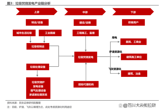 垃圾焚燒發電企業上游主要包括環衛服務(收轉運)、垃圾處理設備;中游包括以垃圾焚燒發電廠為核心的相關招標代理、建設、監理等機構;下游既包括用電單位(居民、工商業等),也包括再生資源化產品用戶(建筑業、冶煉行業等)。