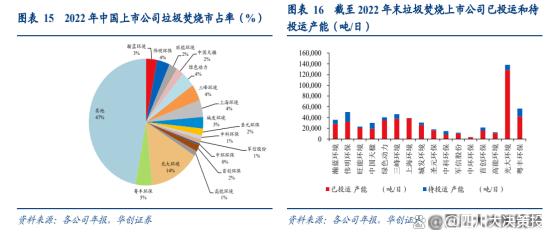 儲備產能減少,上市公司增長空間壓縮。截至 2022 年年末,主流垃圾焚燒上市公司的已投運/總產能均已超過 50%,未來增長空間進一步被壓縮。垃圾焚燒企業的各項財務指標開始由高速增長型向穩健公用事業型過渡。目前 16 家上市公司已投運總產能為 47.22 萬噸/日,占全部垃圾焚燒產能的比重超過 50%。當前中國上市公司垃圾焚燒市場占有率第一位為光大環境,其余公司占有率較為平均,頭部公司占領大部分市場份額,馬太效應顯著。目前上市公司未投運的項目也以中西部地區縣城項目為主,然而縣城項目的盈利因子(垃圾處理費、熱值等)遜于東部城市,如何精細化管理、提升現有項目的運營質量成為現階段垃圾焚燒企業的主要課題。