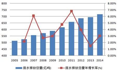 據統計,目前全國地表水體中Ⅰ類、Ⅱ類、Ⅲ類、Ⅳ類、Ⅴ類和劣Ⅴ類水質占比分別為31%、30%、21%、6%、9%和3%,其中Ⅳ類及Ⅳ類以下水質水體占比近4成,水質污染問題嚴重。每年水質污染給人體健康、工業生產、農業生產和漁業養殖等方面造成的經濟損失約2400億。。2014年全國廢水排放總量約為716億噸,較2005年的514億噸增長近4成,2005至2014十年間年復合增長率為3.4%,保持逐年穩步增長。