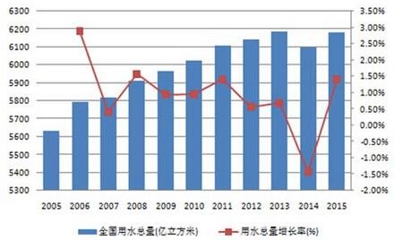 過去10年間,隨著人口增長,城市建設以及經濟增長,全國用水總量總體呈現持續增長態勢,在2015年達到6180億立方米。(其中,由于首次進行最嚴格水資源管理制度考核、以及農業水價綜合改革和工業用水差別水價政策的推進,2014年的農業和工業用水量分別出現下降,全國用水總量同時環比下降1.4%。)05至15年的用水總量年均復合增長率約為0.93%,據此計算到2030年全國用水總量將達到7100億立方米。這一預測與《全國水資源綜合規劃》劃定的2030年用水上限不超過7000億立方米基本一致。因此,在可預見的未來,用水量仍將繼續增長。