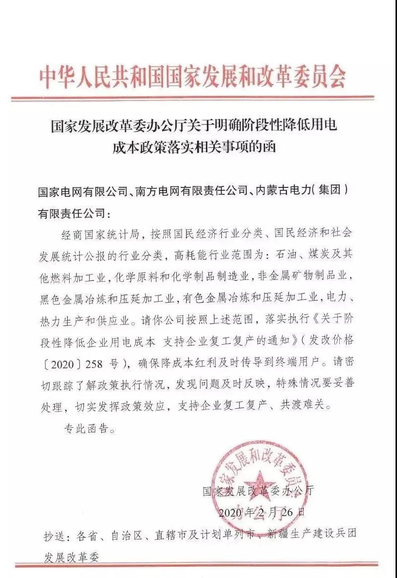 近日,國家發(fā)展改革委印發(fā)《關(guān)于明確階段性降低用電成本政策落實(shí)相關(guān)事項(xiàng)的函》,函件中進(jìn)一步明確高耗能行業(yè)范圍為:石油、煤炭及其他燃料加工業(yè),化學(xué)原料和化學(xué)制品制造業(yè),非金屬礦物制品業(yè),黑色金屬冶煉和壓延加工業(yè),有色金屬冶煉和壓延加工業(yè),電力、熱力生產(chǎn)和供應(yīng)業(yè)。除以上行業(yè)外的工業(yè)用戶及全部商業(yè)用戶可享受電價(jià)95折優(yōu)惠。