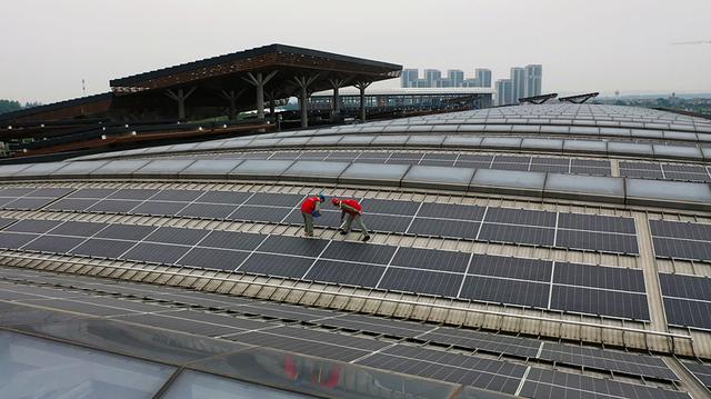 國網湖北電力員工檢查宜都市會展中心光伏設備運行情況。