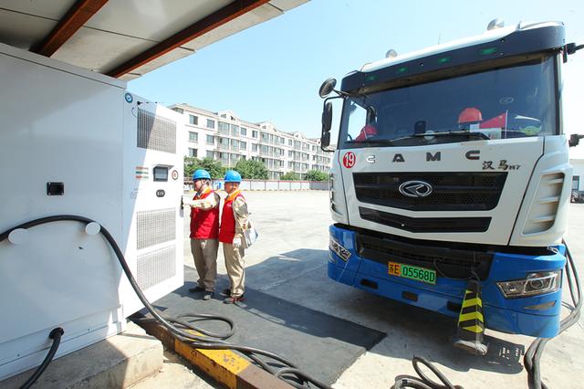 國網江蘇電力員工為江蘇永鋼集團有限公司電動重卡檢查充電樁。