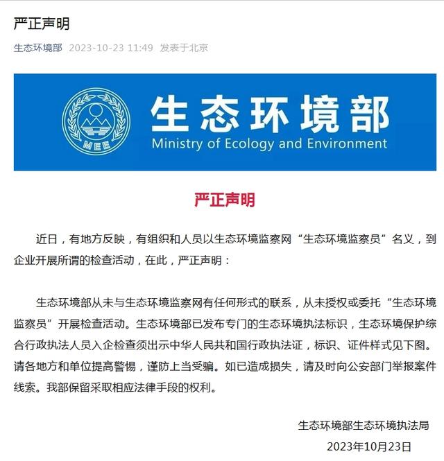 據生態環境部公眾號10月23日消息,近日,有地方反映,有組織和人員以生態環境監察網“生態環境監察員”名義,到企業開展所謂的檢查活動,在此,生態環境部嚴正聲明: