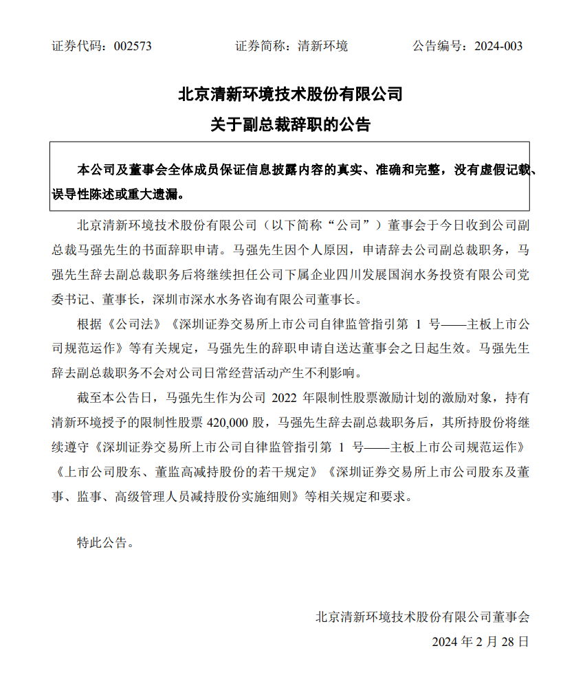 2月28日,清新環(huán)境發(fā)布公告稱,公司董事會于當(dāng)日收到公司副總裁馬強(qiáng)先生的書面辭職申請。馬強(qiáng)先生因個人原因,申請辭去公司副總裁職務(wù),馬強(qiáng)先生辭去副總裁職務(wù)后將繼續(xù)擔(dān)任公司下屬企業(yè)四川發(fā)展國潤水務(wù)投資有限公司黨委書記、董事長,深圳市深水水務(wù)咨詢有限公司董事長。
