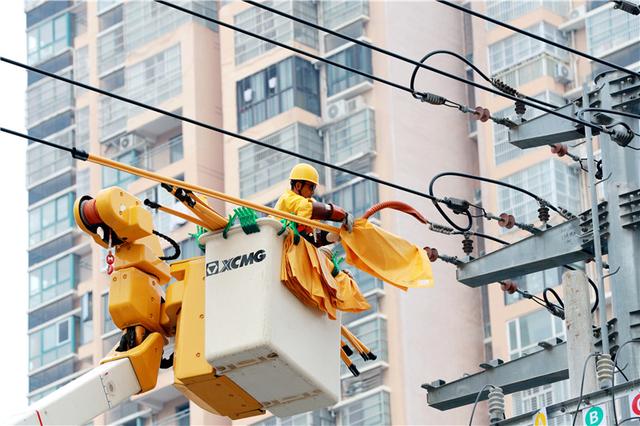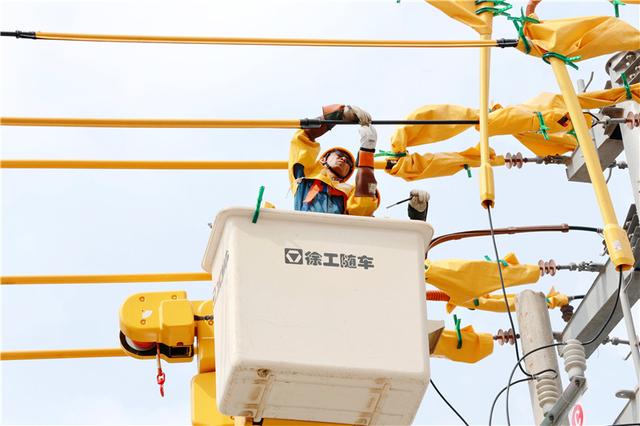 國網利辛縣供電公司帶電作業員工正在進行帶電懸空搭火工作。劉喆攝