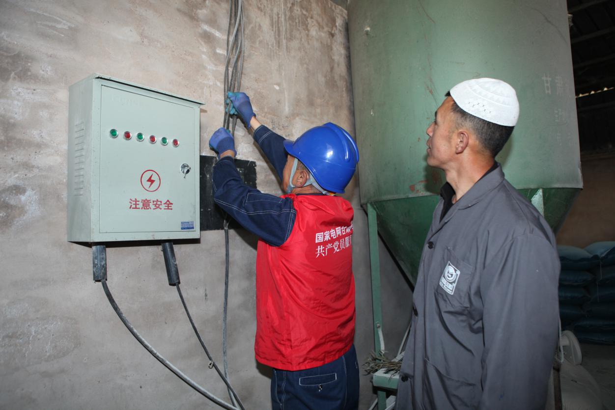 國家電網(wǎng)甘肅電力連心橋(臨夏馬進偉)共產(chǎn)黨員服務隊隊員檢查養(yǎng)殖農(nóng)民專業(yè)合作社安全用電情況。