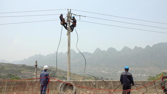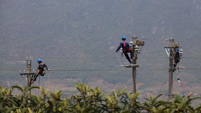 10千伏興頂線施工現場,兩名工作人員電桿作業。盧關文攝