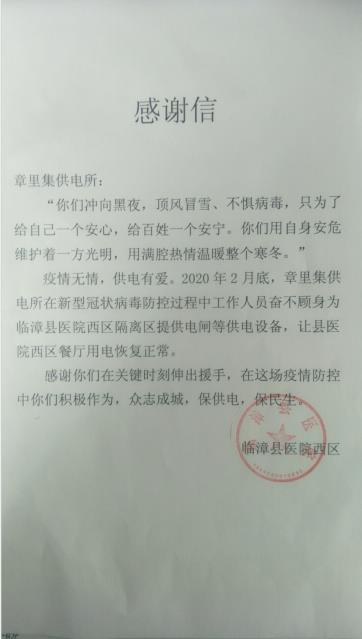 章里集供電所所長吳超接過重量雖輕卻又意義非凡的感謝信后激動地說:“謝謝你們對我們工作的肯定,疫情戰(zhàn)場上,是你們白衣天使沖鋒在前。作為國家電網(wǎng)人,我們更要發(fā)揚頂?shù)蒙稀⒖康米 ⒋虻泌A得電力鐵軍精神,攜手打贏這場沒有硝煙的戰(zhàn)疫!”