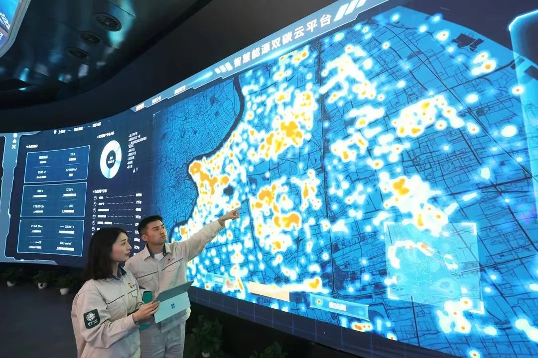 ▲國網上海電力員工利用智慧能源雙碳云平臺為用戶定制節能減排方案