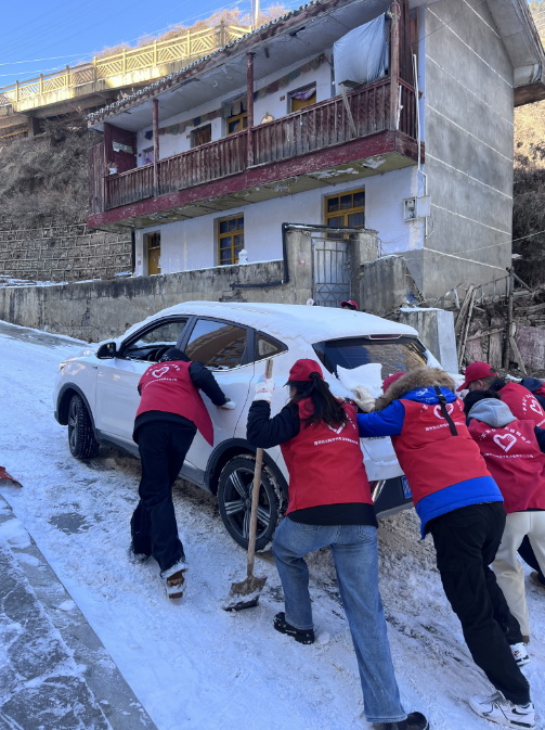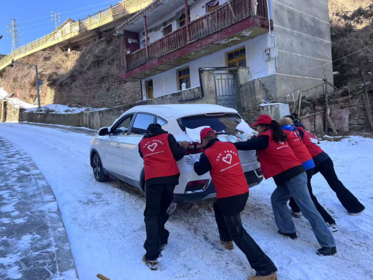 當天早上,在德吉巷路,10余名身穿紅馬甲的“羊角花”志愿者分工協作、互相配合,有的負責鏟除厚重的積雪,有的專注清掃路面,確保不留死角。遇到結冰的地方,志愿者們更是齊心協力,用鐵鍬一點點破冰,再將碎冰和積雪清理干凈。在除雪過程中,一輛汽車爬坡行駛受路面冰雪影響,車輪不斷打滑,無法前進。附近的志愿者們見狀,立刻放下手中工具,迅速趕來幫忙。他們分成兩組,一組在車后用力推動,一組在車前指揮方向,齊聲喊著口號,齊心協力助力車主解決困難。經過近兩小時的共同努力下,道路及兩旁的人行道清理出安全路線,方便群眾出行。