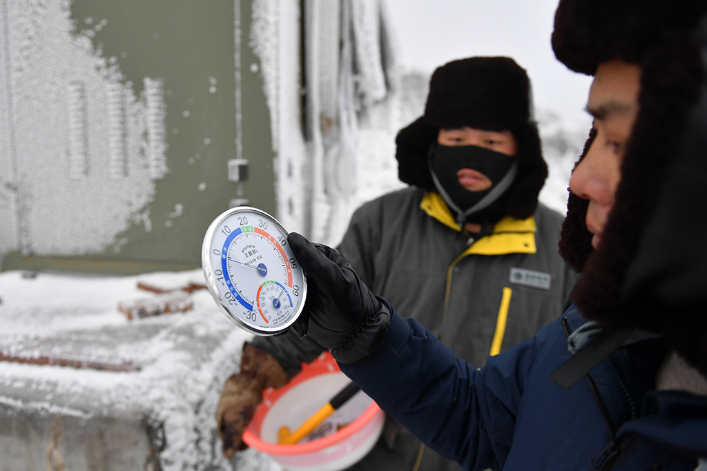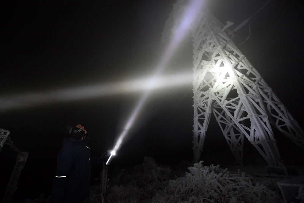 12月19日,尹斌(右)和龍昱君前往110千伏西公線003號監測哨所觀測冰情。新華社記者 陳振海 攝海拔1420米的西晃山,位于湖南省懷化市芷江侗族自治縣和麻陽苗族自治縣交界處。110千伏西公線是西晃山風電場升壓站至220千伏公坪變電站的送電線路工程,為懷化地區提供電能,每年都是湖南省內最早結冰的輸電線路之一。