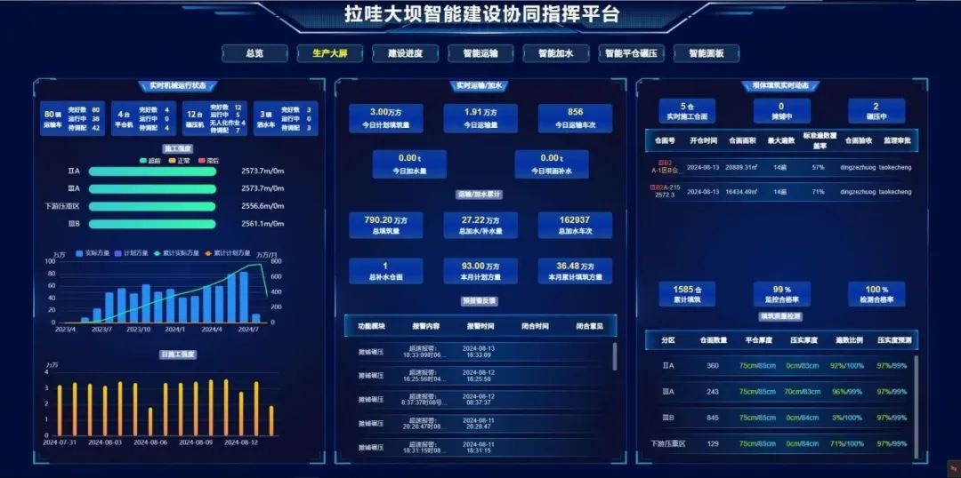 為保障世界級工程高效率高質量建設,項目團隊不斷優化施工規劃,全面應用無人碾壓、智能物料、智能加水、智能攤鋪等技術聯動的智慧大壩協同指揮平臺,全方位提升大壩填筑效率與質量。截至目前,拉哇水電站大壩日填筑方量已突破3萬方,月填筑方量接近100萬方,月上升高度超過13.2米,為目前國內上升速度最快的混凝土面板堆石壩。
