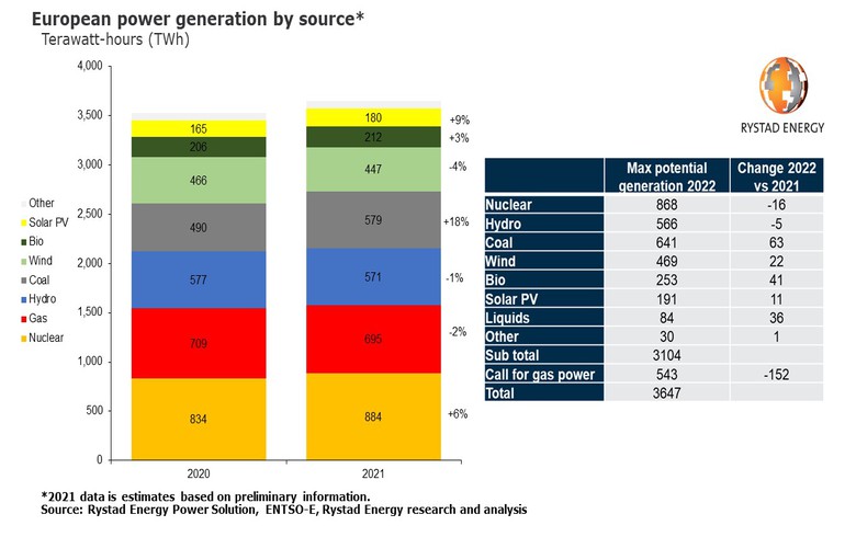 預計,如果天然氣價格繼續居高不下,或者俄羅斯與烏克蘭的沖突減少了燃氣發電量,那么到2022年,煤炭發電量可能會增加11%,達到641TWh。