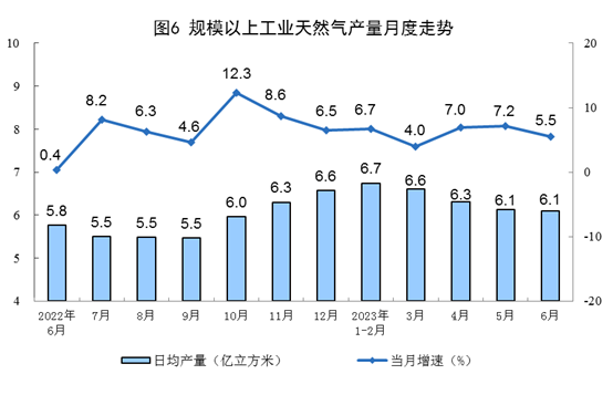 天然氣生產(chǎn)平穩(wěn)增長,進口增速較快。上半年,生產(chǎn)天然氣1155億立方米,同比增長5.4%。進口天然氣5663萬噸,同比增長5.8%。6月份,生產(chǎn)天然氣183億立方米,同比增長5.5%。