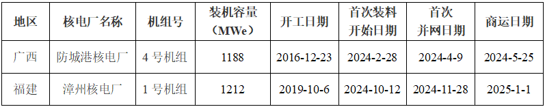 表1:2024年1-12月商運(yùn)核電機(jī)組信息