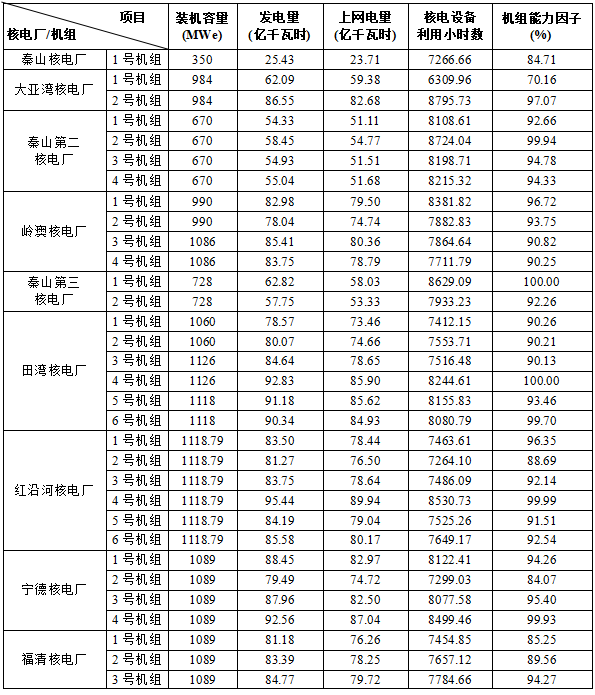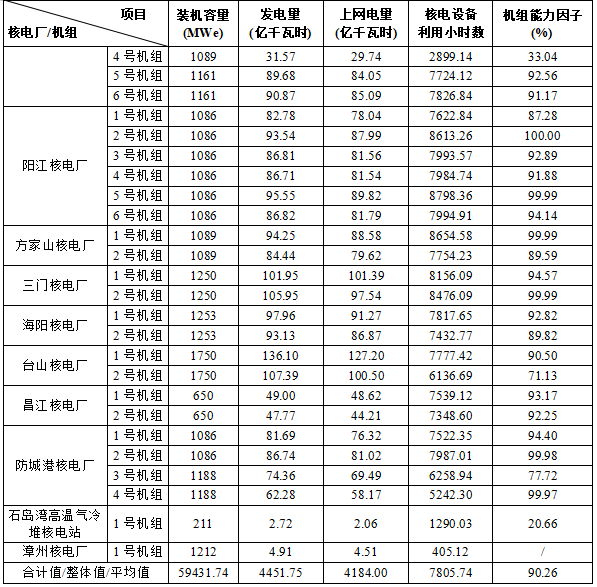 3)本表“合計(jì)值/整體值/平均值”中,裝機(jī)容量、發(fā)電量、上網(wǎng)電量為各機(jī)組合計(jì)值,核電設(shè)備利用小時(shí)數(shù)為全部機(jī)組整體值,機(jī)組能力因子為全部參與統(tǒng)計(jì)機(jī)組的算數(shù)平均值。