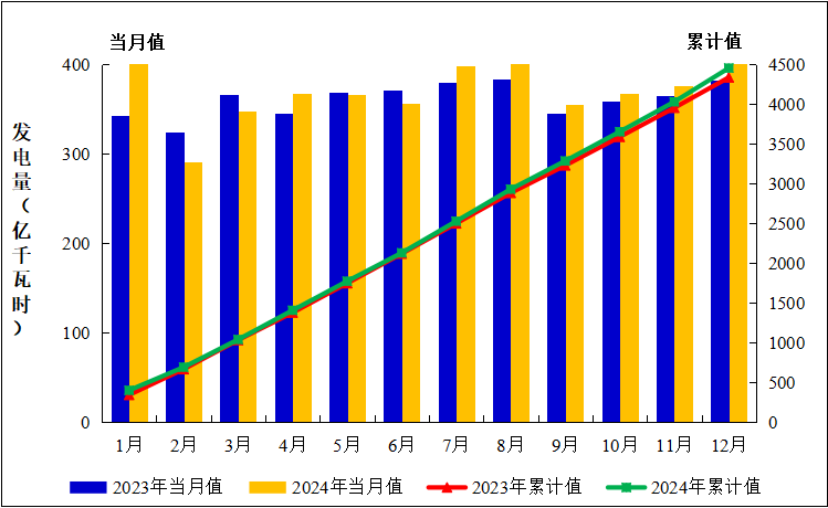 圖2:2023年1月至2024年12月全國運(yùn)行核電機(jī)組發(fā)電量趨勢(shì)