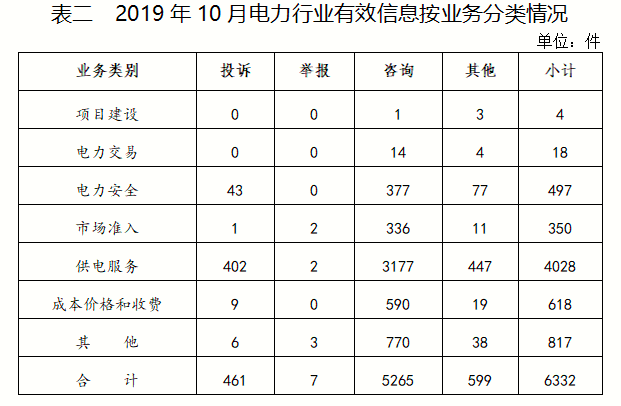 電力行業排在首位,有效信息數量為6332件,占全部有效信息的78.64%;其中受理的投訴舉報數量為449件,占全部投訴舉報數量的92%。群眾反映的問題主要集中在供電服務、電力安全、成本價格和收費等方面。(2019年10月電力行業有效信息按業務分類情況見表二)