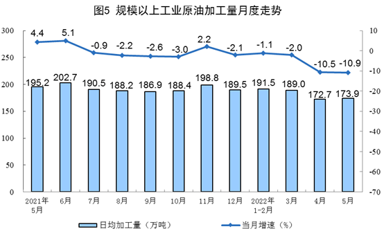 原油加工量繼續下降。5月份,加工原油5392萬噸,同比下降10.9%,降幅比上月擴大0.4個百分點,日均加工173.9萬噸。1—5月份,加工原油27716萬噸,同比下降5.3%。