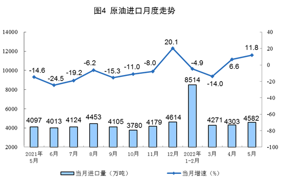 1—5月份,生產原油8569萬噸,同比增長4.1%。進口原油21671萬噸,同比下降1.7%。