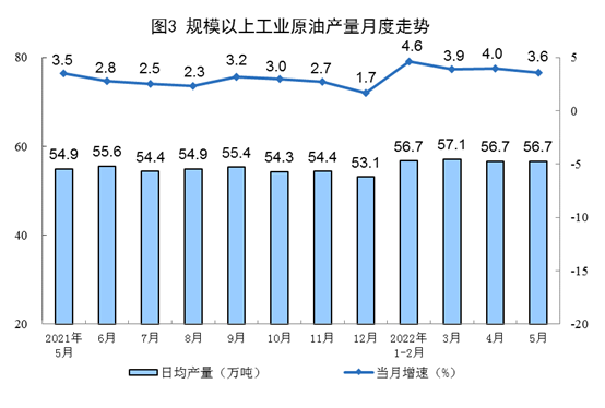 原油生產平穩,進口有所加快。5月份,生產原油1757萬噸,同比增長3.6%,增速比上月放緩0.4個百分點,日均產量56.7萬噸。進口原油4582萬噸,同比增長11.8%,比上月加快5.2個百分點。