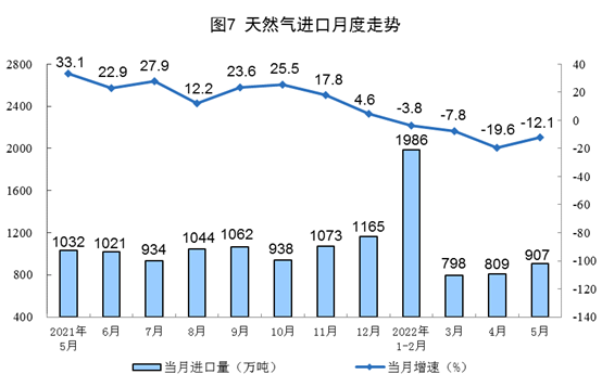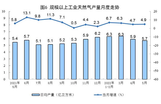 天然氣生產保持穩定,進口降幅收窄。5月份,生產天然氣177億立方米,同比增長4.9%,增速比上月加快0.2個百分點,日均產量5.7億立方米。進口天然氣907萬噸,同比下降12.1%,降幅比上月收窄7.5個百分點。