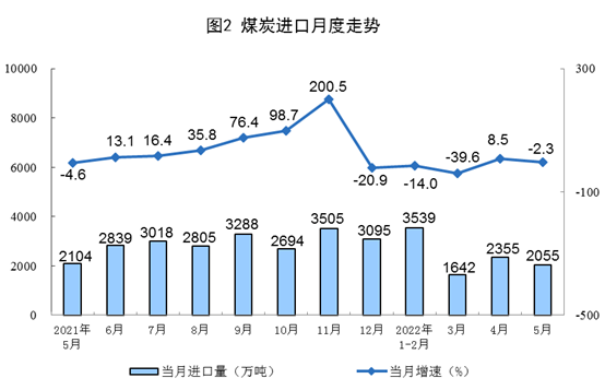 原煤生產保持較快增長,進口由增轉降。隨著煤炭保供穩價政策深入推進,原煤生產繼續保持較快增長。5月份,生產原煤3.7億噸,同比增長10.3%,增速比上月放緩0.4個百分點,日均產量1187萬噸。進口煤炭2055萬噸,同比下降2.3%,上月為增長8.5%。