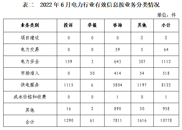 電力行業(yè)排在首位,有效信息數(shù)量為10778件,占全部有效信息的72.93%。群眾關注的內容主要集中在供電服務、停電搶修、用戶受電工程市場秩序等方面。(2022年6月電力行業(yè)有效信息按業(yè)務分類情況見表二)