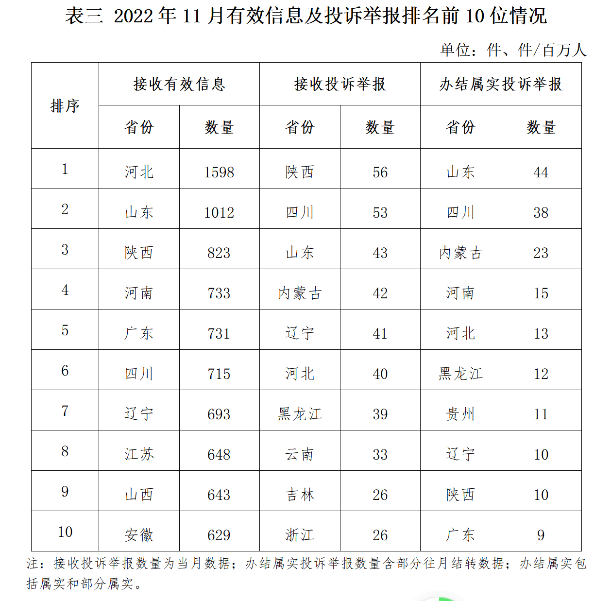 各省(自治區、直轄市)按照接收的有效信息數量排序,河北、山東、陜西、河南、廣東、四川、遼寧、江蘇、山西、安徽排在全國前10位;按照接收的投訴舉報數量排序,陜西、四川、山東、內蒙古、遼寧、河北、黑龍江、云南、吉林、浙江排在全國前10位;按照辦結屬實的投訴舉報數量排序,山東、四川、內蒙古、河南、河北、黑龍江、貴州、遼寧、陜西、廣東古排在全國前10位。(2022年11月有效信息及投訴舉報排名前10位情況見表三)