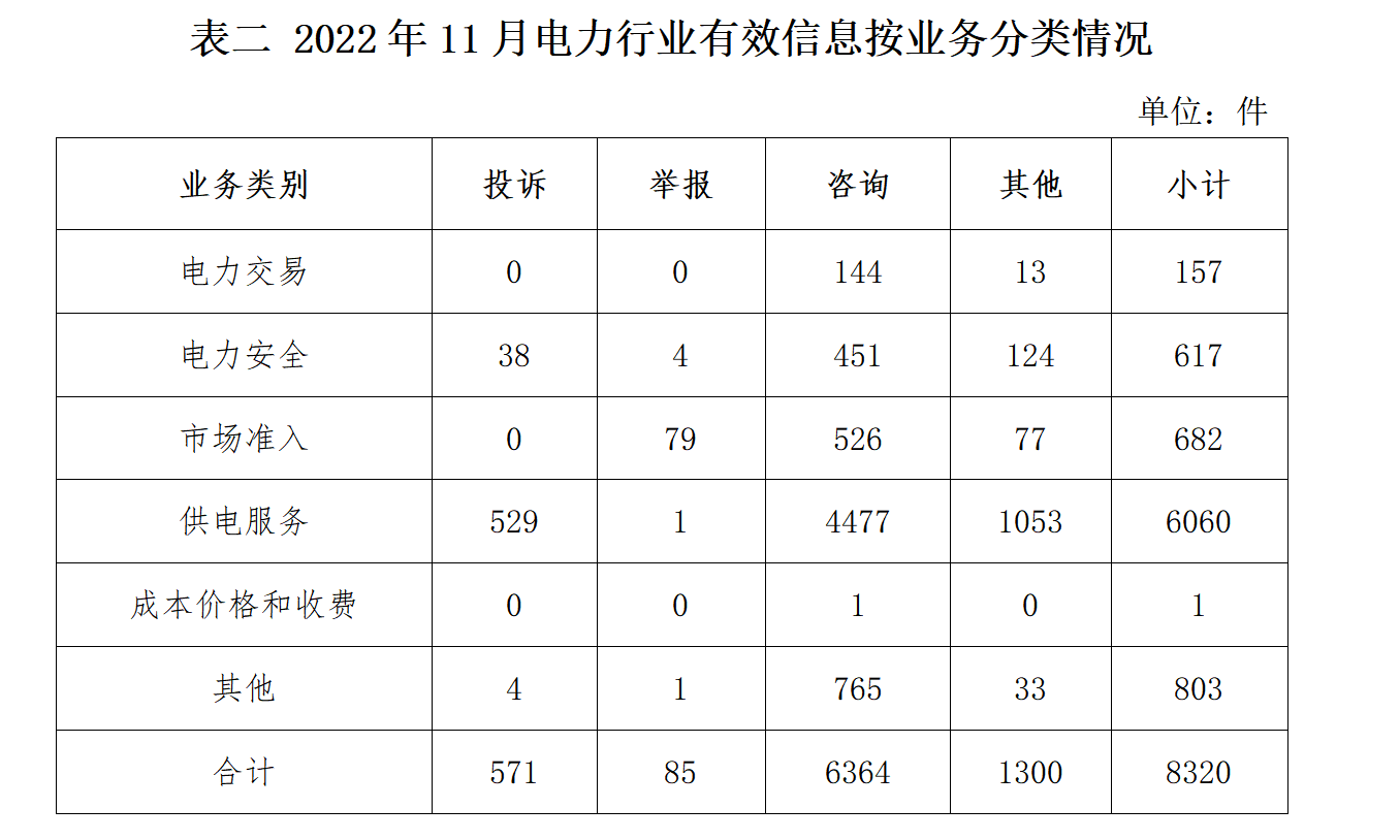 電力行業排在首位,有效信息數量為8320件,占全部有效信息的60.22%。群眾關注的內容主要集中在供電服務、電力安全、市場準入等方面。(2022年11月電力行業有效信息按業務分類情況見表二)