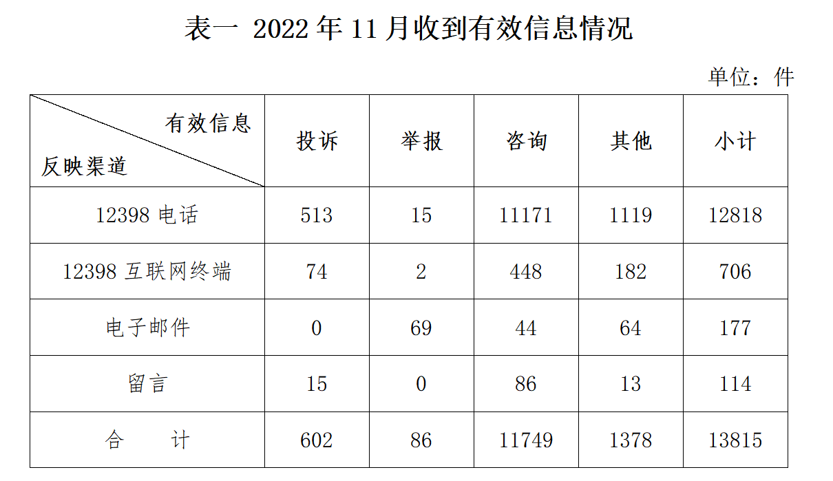 2022年11月,國家能源局12398能源監管熱線(以下簡稱12398熱線)共收到有效信息13815件(包含投訴、舉報、咨詢和其他訴求類別),環比增加4.36%,同比增加6.82%。(2022年11月收到有效信息情況見表一)