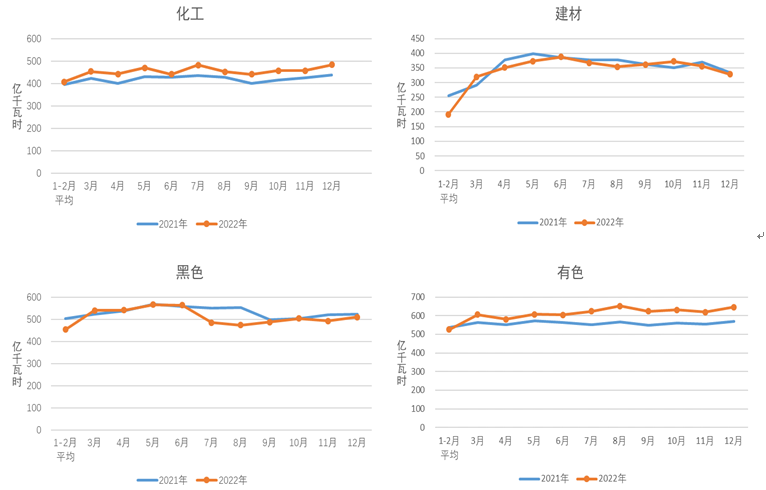 圖2 2021、2022年重點行業分月用電量情況