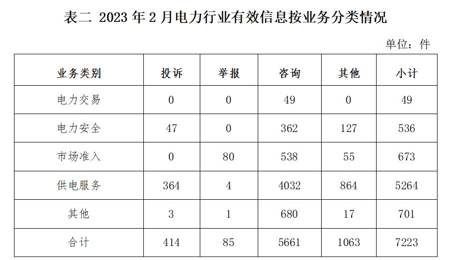 電力行業排在首位,有效信息數量為7223件,占全部有效信息的70.37%。群眾關注的內容主要集中在供電服務、電力安全、成本價格和收費等方面。(2023年2月電力行業有效信息按業務分類情況見表二)