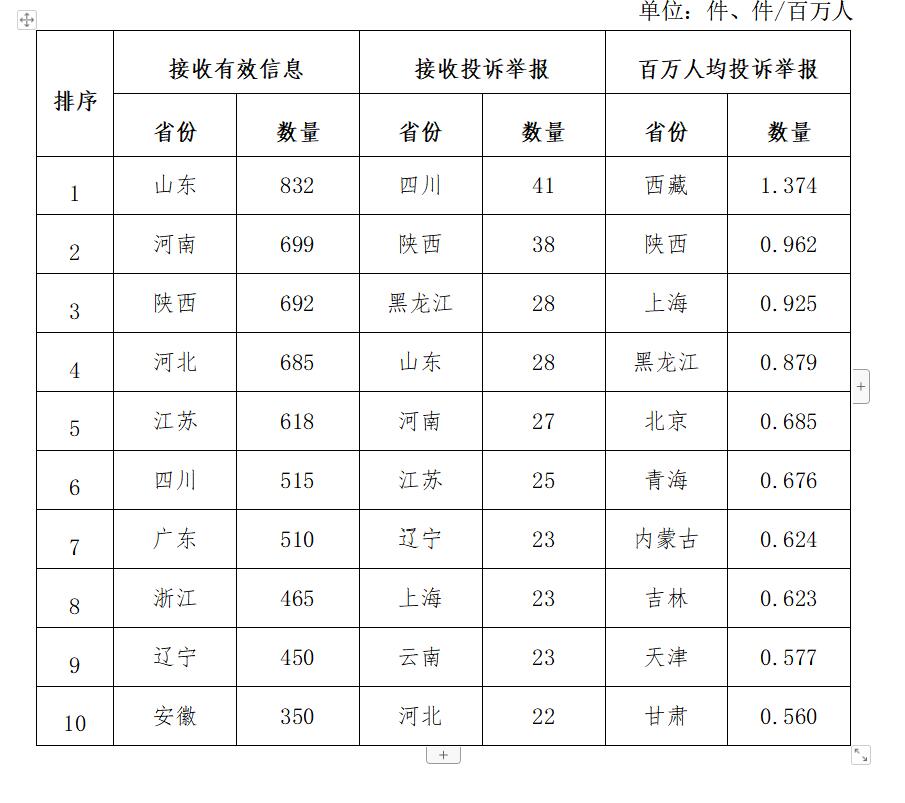 各省(自治區、直轄市)按照接收的有效信息數量排序,山東、河南、陜西、河北、江蘇、四川、廣東、浙江、遼寧、安徽排在全國前10位;按照接收的投訴舉報數量排序,四川、陜西、黑龍江、山東、河南、江蘇、遼寧、上海、云南、河北排在全國前10位;按照百萬人均投訴舉報數量排序,西藏、陜西、上海、黑龍江、北京、青海、內蒙古、吉林、天津、甘肅排在全國前10位。(2023年2月有效信息及投訴舉報排名前10位情況見表三)
