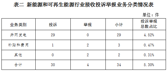 新能源和可再生能源行業排在第二位,數量為34件、占投訴舉報總數的5.30%,主要集中在并網發電、補貼和費用等方面。