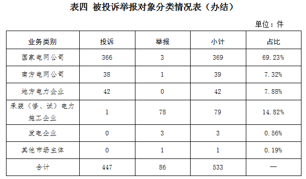 從被投訴舉報對象看,供電企業450件、占投訴舉報總數的84.43%,其中國家電網公司369件、占投訴舉報總數的69.23%,南方電網公司39件、占投訴舉報總數的7.32%,地方電力企業42件、占投訴舉報總數的7.88%;承裝(修、試)電力施工企業79件、占投訴舉報總數的14.82%;發電企業3件、占投訴舉報總數的0.56%;其他市場主體1件、占投訴舉報總數的0.19%。
