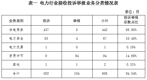 電力行業排在首位,數量為606件、占投訴舉報總數的94.54%,主要集中在供電服務、資質許可、電力安全、電力交易等方面。