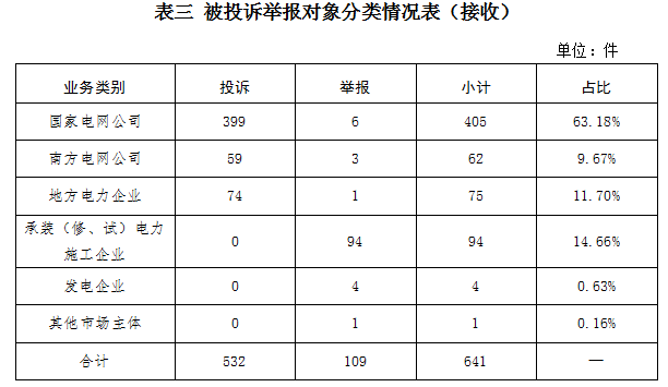 供電企業542件、占投訴舉報總數的84.55%,其中國家電網公司405件、占投訴舉報總數的63.18%,南方電網公司62件、占投訴舉報總數的9.67%,地方電力企業75件、占投訴舉報總數的11.70%;承裝(修、試)電力施工企業94件、占投訴舉報總數的14.66%;發電企業4件、占投訴舉報總數的0.63%;其他市場主體1件、占投訴舉報總數的0.16%。