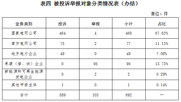 從被投訴舉報對象看,供電企業594件、占投訴舉報總數的85.84%,其中國家電網公司468件、占比67.63%,南方電網公司77件、占比11.13%,地方電力企業49件、占比7.08%;承裝(修、試)電力設施施工企業95件、占比13.73%;新能源和可再生能源發電企業2件、占比0.29%;其他市場主體1件、占比0.14%。