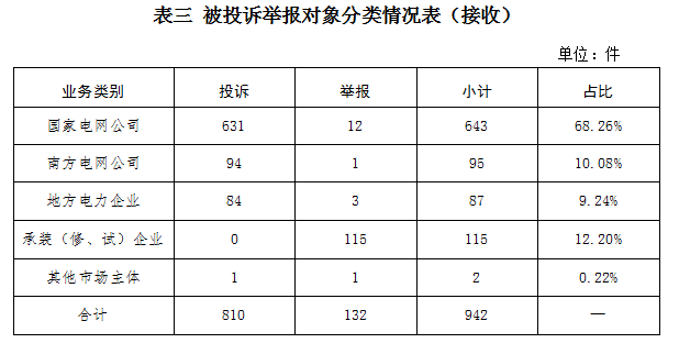 供電企業825件、占投訴舉報總數的87.58%,其中國家電網公司643件、占投訴舉報總數的68.26%,南方電網公司95件、占投訴舉報總數的10.08%,地方電力企業87件、占投訴舉報總數的9.24%;承裝(修、試)電力施工企業115件、占投訴舉報總數的12.20%;其他市場主體2件、占投訴舉報總數的0.22%。