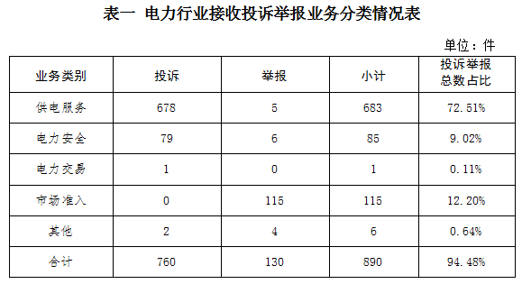 電力行業排在首位,數量為890件、占投訴舉報總數的94.48%,主要集中在供電服務、市場準入、電力安全等方面。
